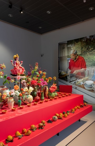 Okergeel, diepe oranjes, warme groentinten en allerlei kleuren bruin: de vazen en vruchten op deze tafel zijn met zorg gekozen om hun warme kleuren en, hier en daar, goudtinten. Die warme tinten brengen namelijk geluk en voorspoed tijdens de viering van Divali.