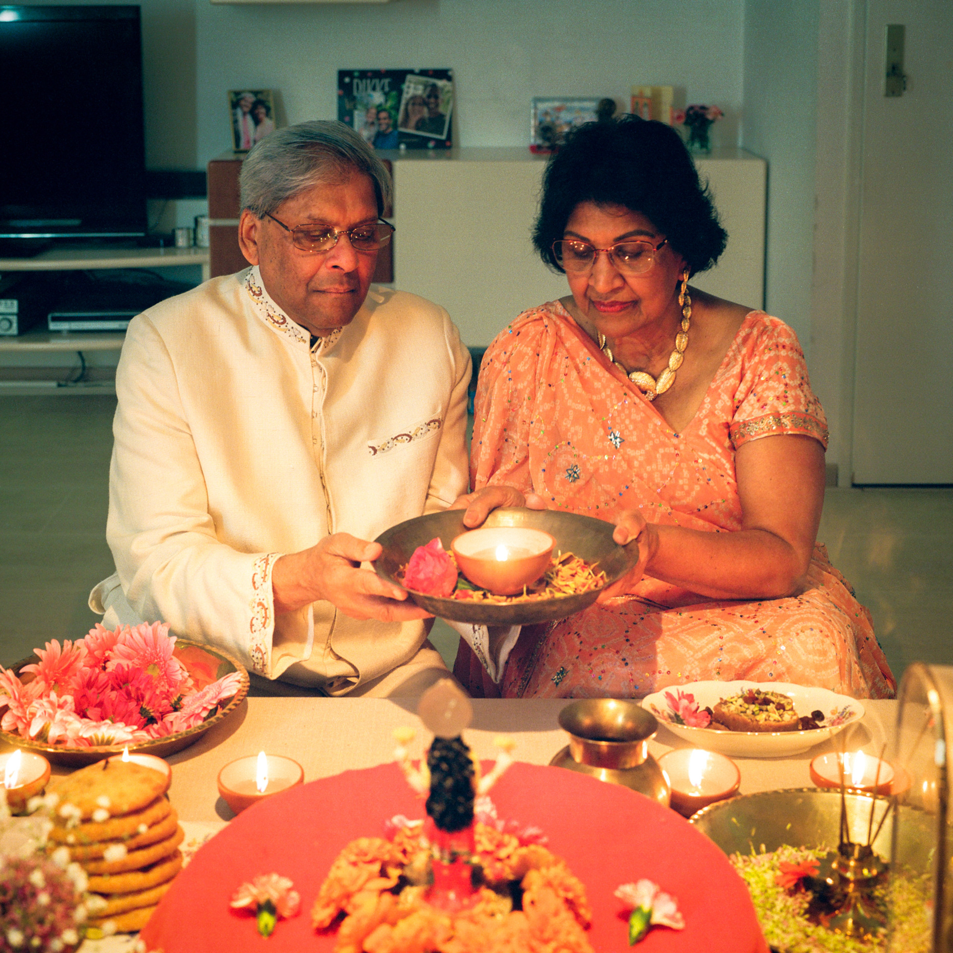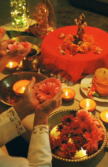 Verspreid over deze tafel liggen allerlei soorten zoet fruit en bloemen, die tijdens de viering van Divali worden geofferd aan Lakshmi. Alles moet helemaal gaaf zijn: de bloemen fris en heel, de vruchten vers en zonder beurse plekken.